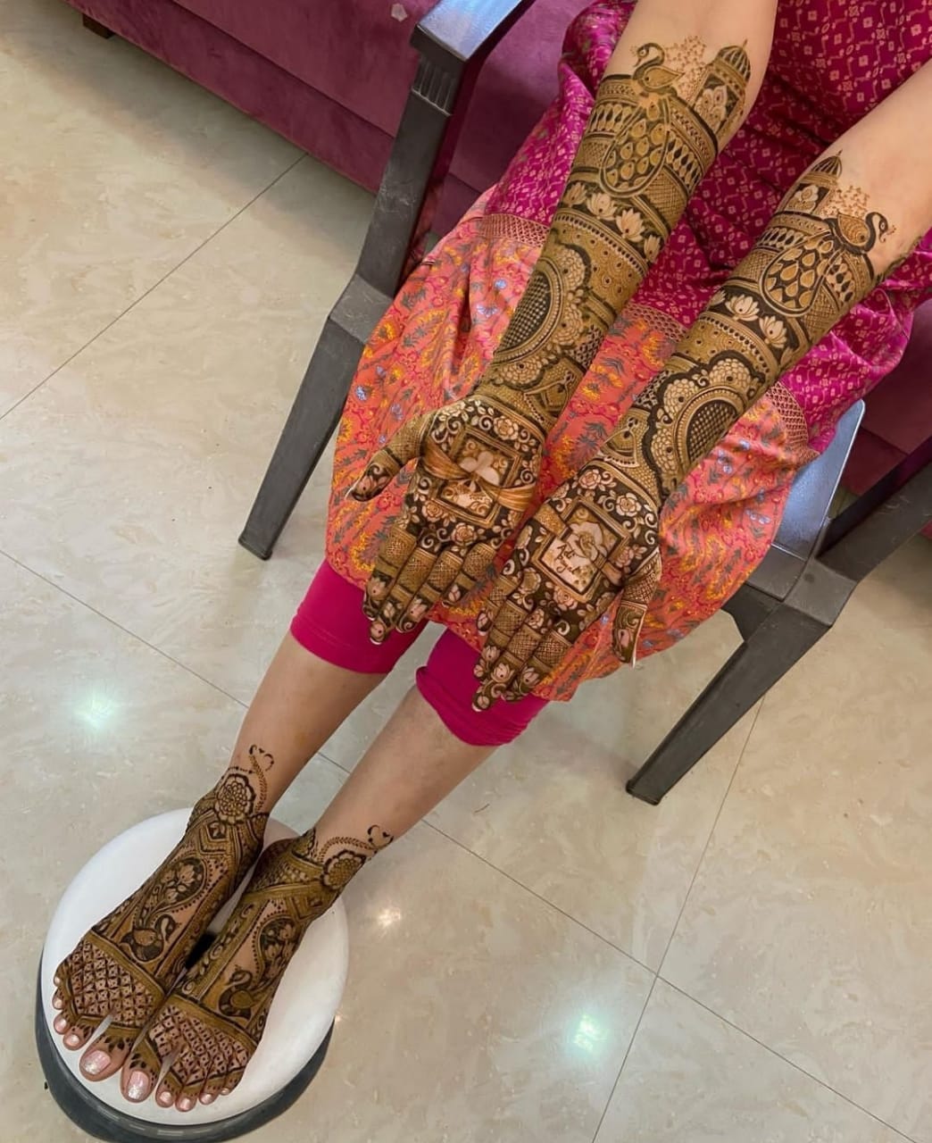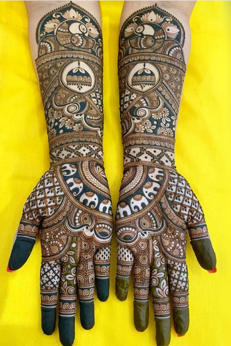 Gujarati mehndi patterns portray fabulous peacocks, leaves, flowers, and additional known trims.